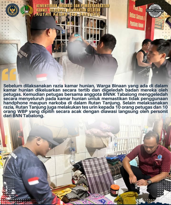 TIMELINES INEWS INVESTIGASI, Tanjung Rumah Tahanan Negara (Rutan) Kelas IIB Tanjung Kantor Wilayah Kementerian Hukum dan HAM Kalimantan Selatan terus menunjukkan komitmennya dalam mewujudkan lingkungan pemasyarakatan yang bersih dan kondusif. Salah satu langkah konkret yang dilakukan yakni dengan melaksanakan razia kamar hunian serta tes urine terhadap Warga Binaan Pemasyarakatan (WBP) dan petugas, Kamis (4/7/2025).