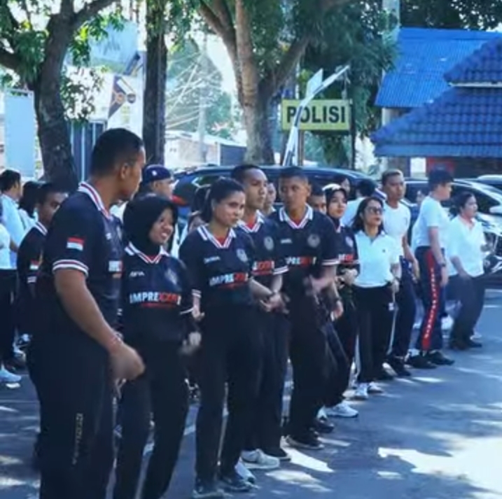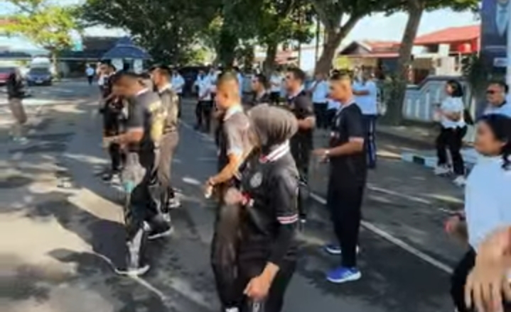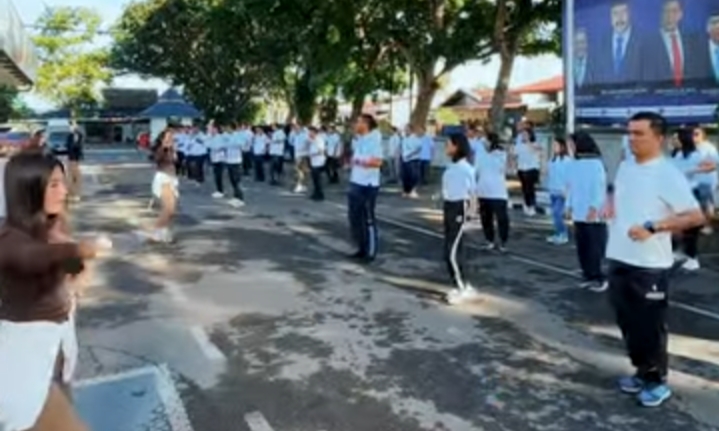 Senam pagi dimulai pukul 08.00 WIB dengan instruktur senam yang memimpin gerakan dinamis dan enerjik. Para pegawai tampak bersemangat mengikuti irama musik dan gerakan yang bertujuan meningkatkan daya tahan tubuh sekaligus mengurangi ketegangan setelah rutinitas kerja sehari-hari.