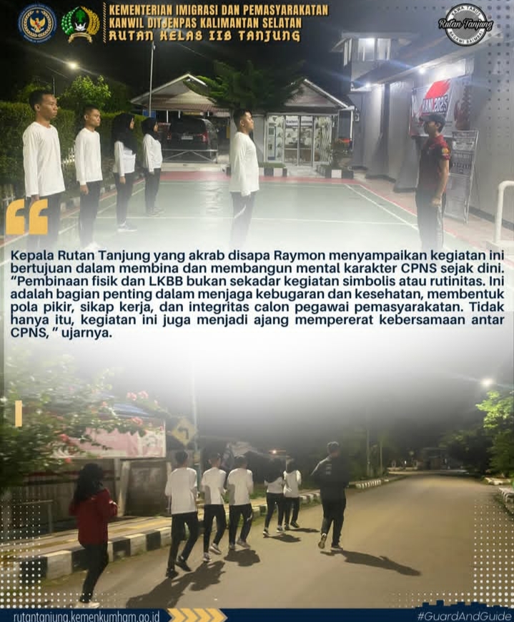 Kepala Rutan Tanjung, Raymon Andika Girsang, menyampaikan bahwa pembinaan fisik dan mental sangat penting untuk membentuk karakter CPNS yang berintegritas dan siap mengabdi.“Pembinaan fisik dan LKBB bukan sekadar kegiatan simbolis atau rutinitas. Ini adalah bagian penting dalam menjaga kebugaran, membentuk pola pikir, sikap kerja, dan integritas calon pegawai pemasyarakatan. Tidak hanya itu, kegiatan ini juga menjadi ajang mempererat kebersamaan antar CPNS,” jelas Raymon.