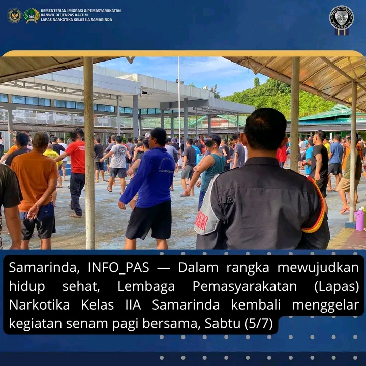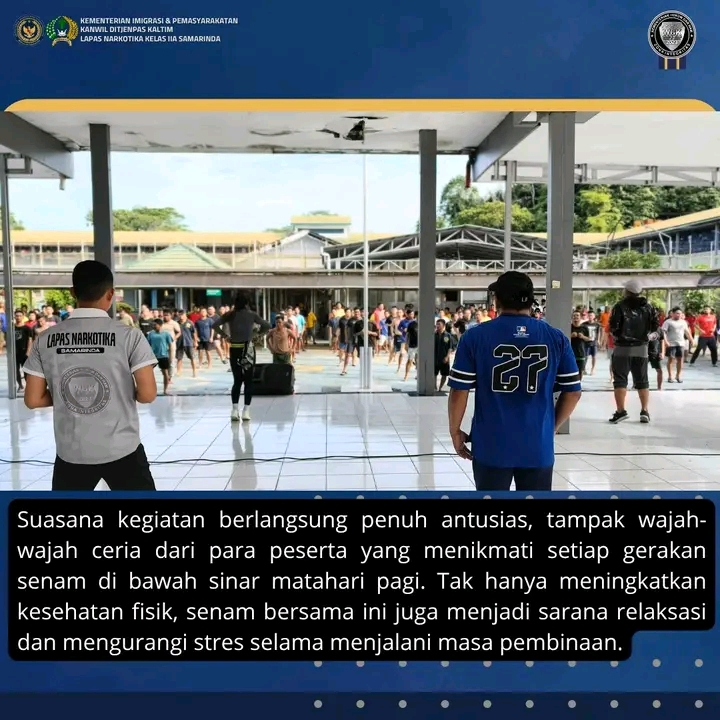 Bertempat di Lapangan dalam Lapas Narkotika Samarinda kegiatan ini diikuti Seluruh Petugas dan Warga Binaan Pemasyarakatan (WBP) Kegiatan senam pagi tersebut merupakan bagian dari program pembinaan jasmani yang rutin dilaksanakan setiap akhir pekan. Dengan menggandeng instruktur senam dari luar, para peserta diajak untuk bergerak aktif dan menjaga kebugaran tubuh melalui gerakan senam yang menyenangkan dan mudah diikuti.