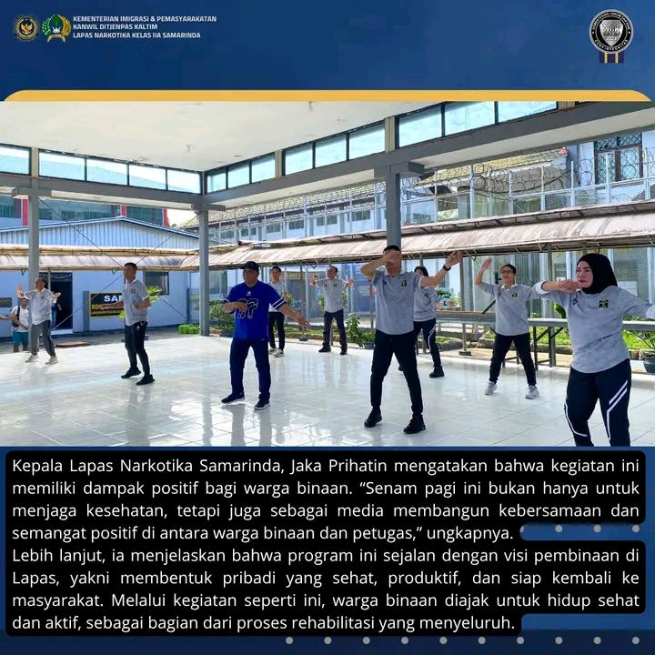 Kepala Lapas Narkotika Samarinda, Jaka Prihatin mengatakan bahwa kegiatan ini memiliki dampak positif bagi warga binaan. “Senam pagi ini bukan hanya untuk menjaga kesehatan, tetapi juga sebagai media membangun kebersamaan dan semangat positif di antara warga binaan dan petugas,” ungkapnya.