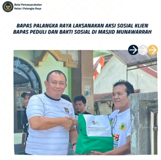 TIMELINES INEWS INVESTIGASI, Palangkaraya Balai Pemasyarakatan (Bapas) Kelas I Palangka Raya melaksanakan Bhakti Sosial dan Aksi Sosial Klien Bapas Peduli Tahun 2025 di Masjid Al-Munawarrah, Jumat (8/8/2025). Kegiatan ini dihadiri oleh Kepala Bapas Palangka Raya, Theo Adrianus, beserta jajaran, pengurus masjid, dan klien pemasyarakatan.