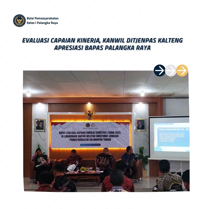 TIMELINES INEWS INVESTIGASI, Palangka Raya, 22 Agustus 2025 Kepala Balai Pemasyarakatan (Bapas) Kelas I Palangka Raya, Theo Adrianus, menghadiri Rapat Evaluasi Kinerja Semester I Tahun 2025 yang digelar di Aula Kantor Wilayah Direktorat Jenderal Pemasyarakatan (Ditjenpas) Kalimantan Tengah pada Jumat (22/8).