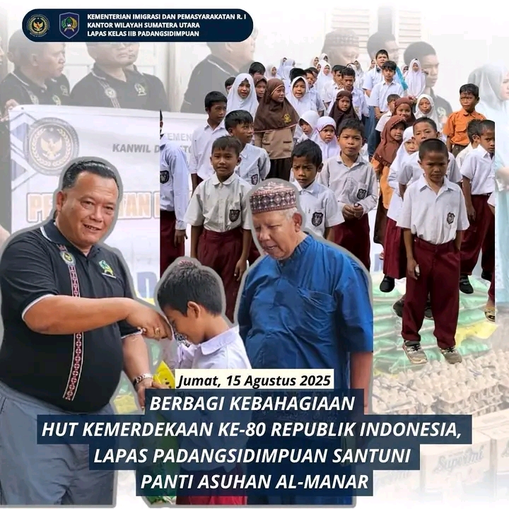 TIMELINES INEWS INVESTIGASI, Padangsidimpuan Jelang peringatan Hari Ulang Tahun (HUT) ke-80 Kemerdekaan Republik Indonesia, Lembaga Pemasyarakatan (Lapas) Kelas IIB Padangsidimpuan gelar bakti sosial di Panti Asuhan Al-Manar Desa Ujung Gurap Kecamatan Batunadua, Jumat (15/8/2025). Kegiatan dipimpin langsung Kalapas Padangsidimpuan, Mathrios Zulhidayat Hutasoit, bersama jajaran pegawai.