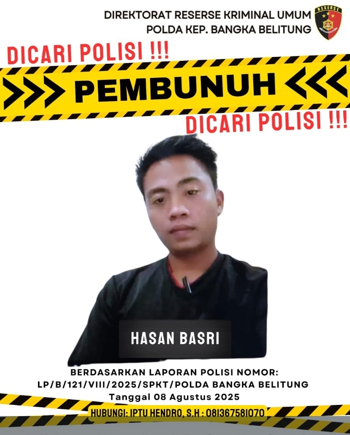 Polisi mengimbau masyarakat yang mengetahui keberadaan Hasan Basri untuk segera melapor ke Tim Jatanras Polda Babel (Iptu Hendro – 0813-6758-1070) atau kantor polisi terdekat.