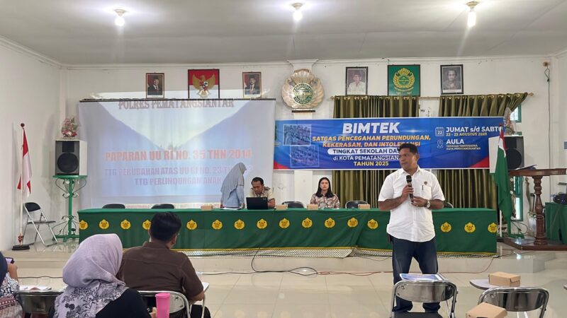 TLii|SUMUT|SIANTAR|Satuan Reserse Kriminal (Sat Reskrim) Polres Pematangsiantar melalui Kanit Perlindungan Perempuan dan Anak (PPA) IPDA Darwin P. Siregar SH hadiri kegiatan penyuluhan atau Bimtek Satgas Pencegahan Perundungan, Kekerasan dan Intoleransi Tingkat Sekolah Dasar (SD) bertempat di Aula SMP Taman Siswa, Jl. Kartini, Kelurahan Proklamasi Kecamatan Siantar Barat Kota Pematangsiantar, pada hari Sabtu 23 Agustus 2025 pagi pukul : 08.00 Wib.