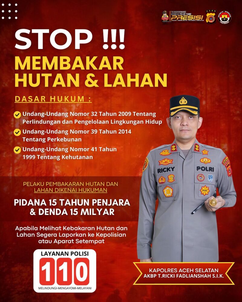 Melalui imbauan ini, Polres Aceh Selatan berharap terjalin kerja sama yang baik antara aparat penegak hukum, pemerintah daerah, dan seluruh elemen masyarakat dalam menjaga kelestarian lingkungan serta mencegah terjadinya kebakaran hutan dan lahan di wilayah Kabupaten Aceh Selatan.