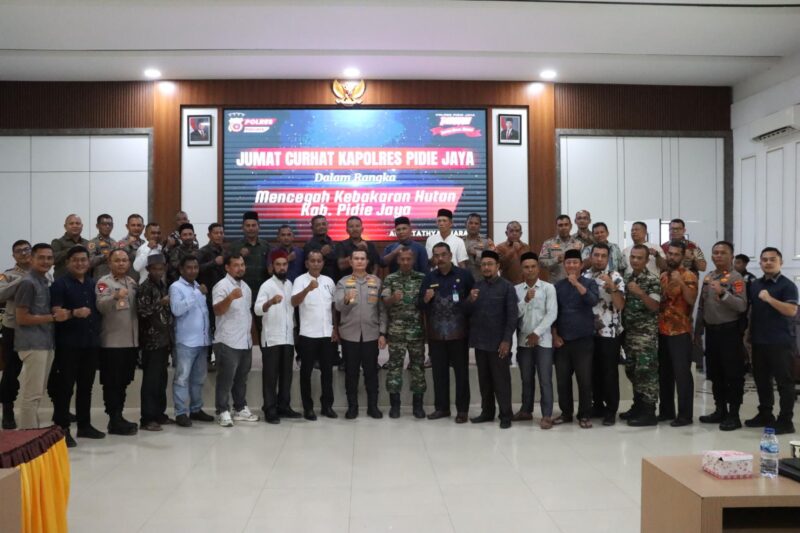 TLii >>> Pidie Jaya – Polres Pidie Jaya menggelar kegiatan Jumat Curhat dengan fokus pencegahan kebakaran hutan dan lahan (Karhutla). Acara berlangsung di Aula Tahthya Dharaka, Gampong Teungkluet, Kecamatan Trienggadeng, Jumat (29/8/2025).