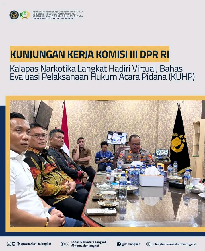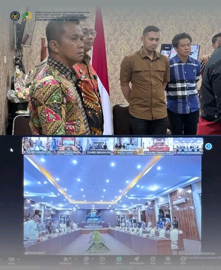 TIMELINES INEWS INVESTIGASI, Langkat Jum’at 22 Agustus 2025 Kepala Lembaga Pemasyarakatan (Kalapas) Narkotika Kelas IIA Langkat, Tapianus Antonio Barus menghadiri kegiatan kunjungan kerja Komisi III Dewan Perwakilan Rakyat Republik Indonesia (DPR RI) dalam rangka evaluasi pelaksanaan Hukum Acara Pidana (KUHP) secara Virtual Zoom di ruang kerja Kepala Polisi Resor Langkat, bersama Jajaran unsur Aparat Penegak Hukum (APH) Kabupaten Langkat, Jumat (22/08/2025).