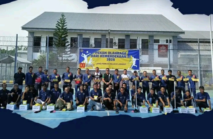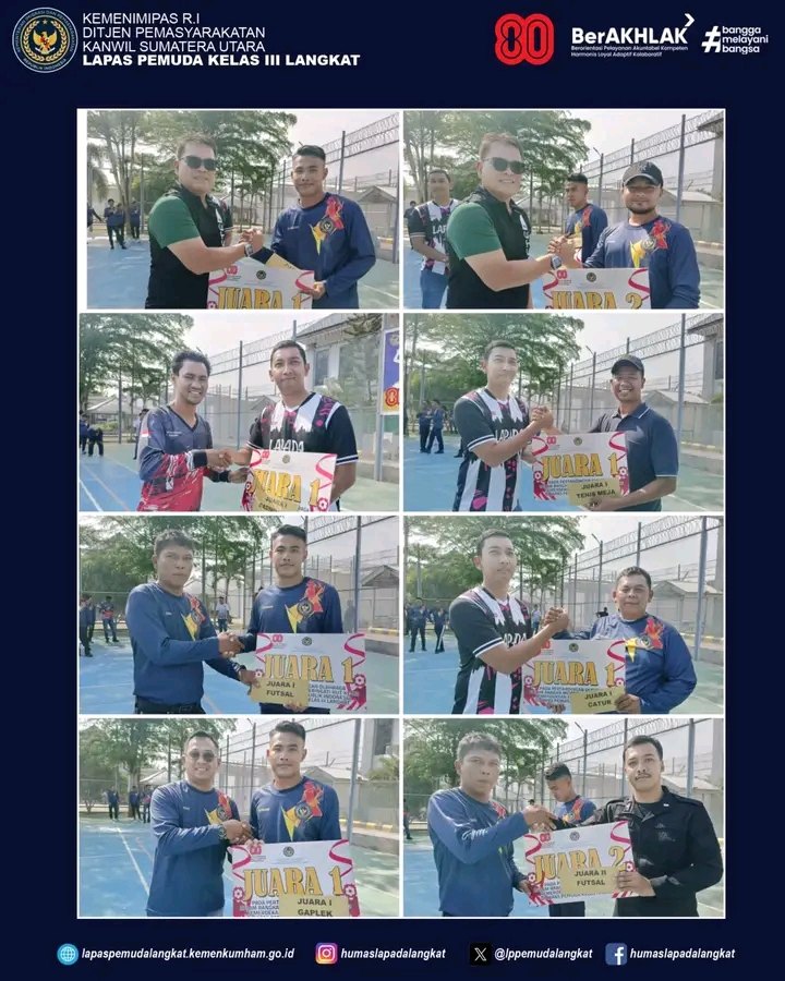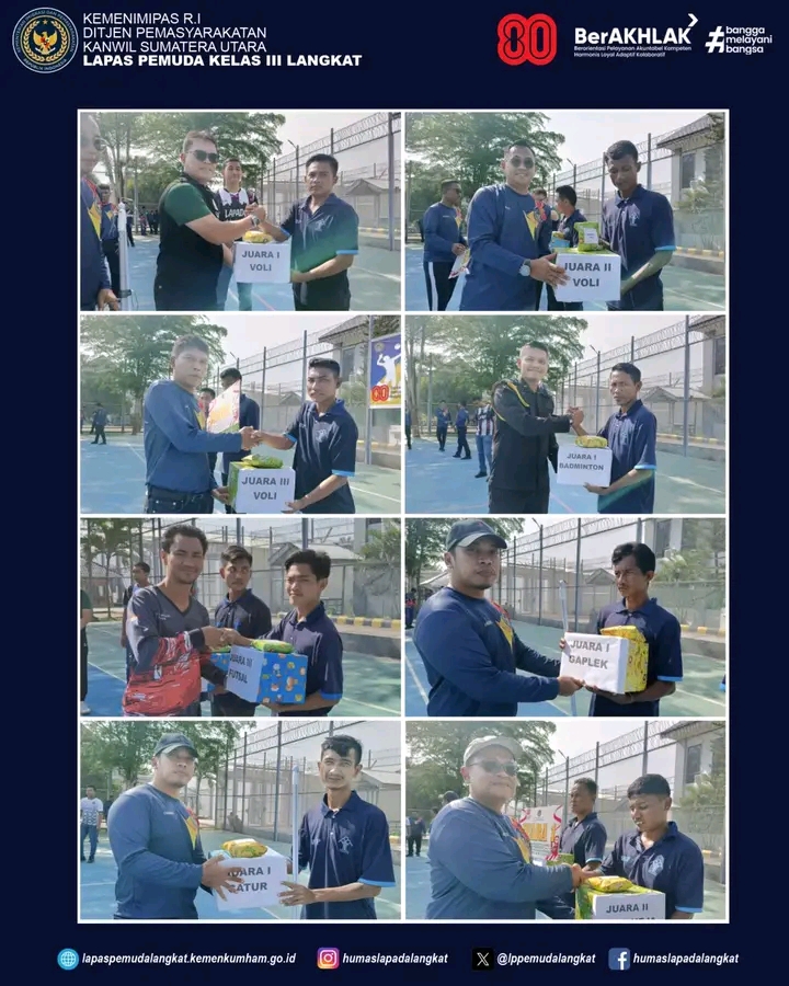 TIMELINES INEWS INVESTIGASI, Langkat Lembaga Pemasyarakatan Pemuda Kelas III Langkat bagikan hadiah kepada para pemenang pekan Olahraga dalam peringatan Hari Ulang Tahun Ke-80 Republik Indonesia, Sabtu (16/8/2025). Pembagian hadiah perlombaan ini dipimpin oleh Kalapas Pemuda Langkat, Kenal Purba diikuti para pejabat struktural, staf, dan Warga Binaan Pemasyarakatan (WBP) bertempat di Lapangan Upacara Gedung II Lapas Pemuda Langkat.