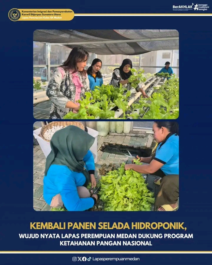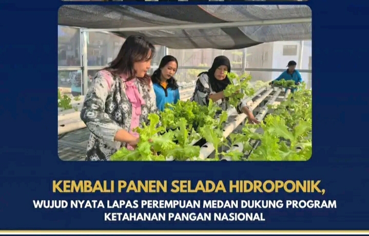 TIMELINES INEWS INVESTIGASI, Medan, 09 Agustus 2025 Lembaga Pemasyarakatan (Lapas) Perempuan Kelas IIA Medan kembali memanen hasil sayuran hidroponik di area kebun lapas, Sabtu (9/8). Panen kali ini menghasilkan 4,6 kilogram selada segar yang langsung diolah di kantin lapas untuk dikonsumsi warga binaan.