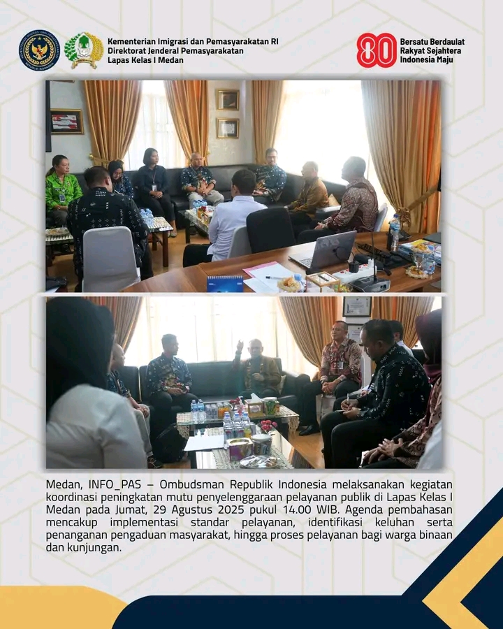 TIMELINES INEWS INVESTIGASI, Medan Jum’at 29 Agustus 2025 Ombudsman Republik Indonesia melakukan kunjungan kerja ke Lembaga Pemasyarakatan (Lapas) Kelas I Medan dalam rangka memastikan peningkatan mutu penyelenggaraan pelayanan publik, Jumat (29/08/2025) pukul 14.00 WIB.
