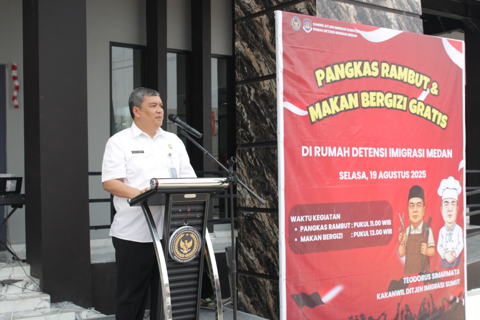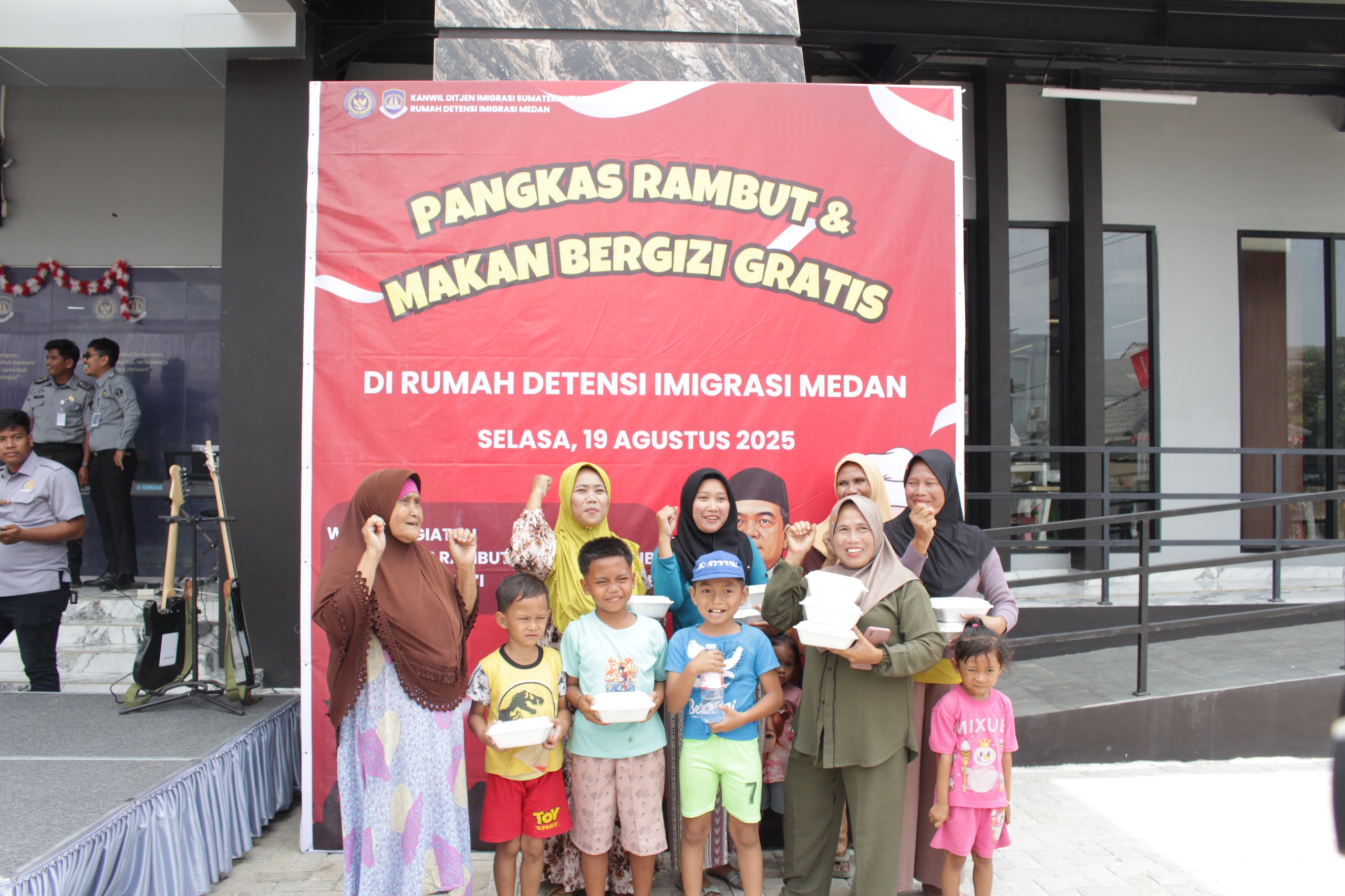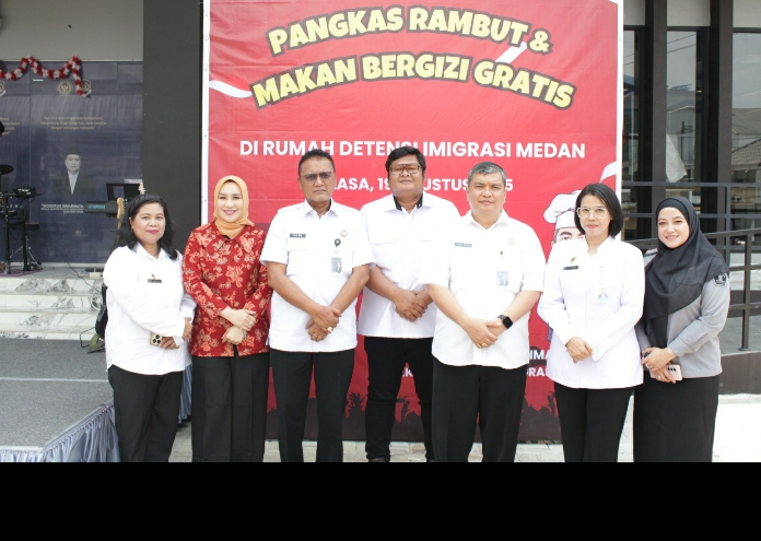 TIMELINES INEWS INVESTIGASI, Medan, 19 Agustus 2025 Dalam rangka menyemarakkan Hari Ulang Tahun ke-80 Kemerdekaan Republik Indonesia dengan tema “Bersatu Berdaulat, Rakyat Sejahtera, Indonesia Maju”, Rumah Detensi Imigrasi (Rudenim) Medan yang berada di bawah Kantor Wilayah Direktorat Jenderal Imigrasi Sumatera Utara mengadakan kegiatan Pangkas Rambut Gratis dan Makan Bergizi Gratis bagi masyarakat sekitar. Acara ini digelar di Jalan Tojai, Komplek Mabar SBU Estate, Kelurahan Mabar Hilir, Kecamatan Medan Deli, Kota Medan, pada Selasa (19/8).