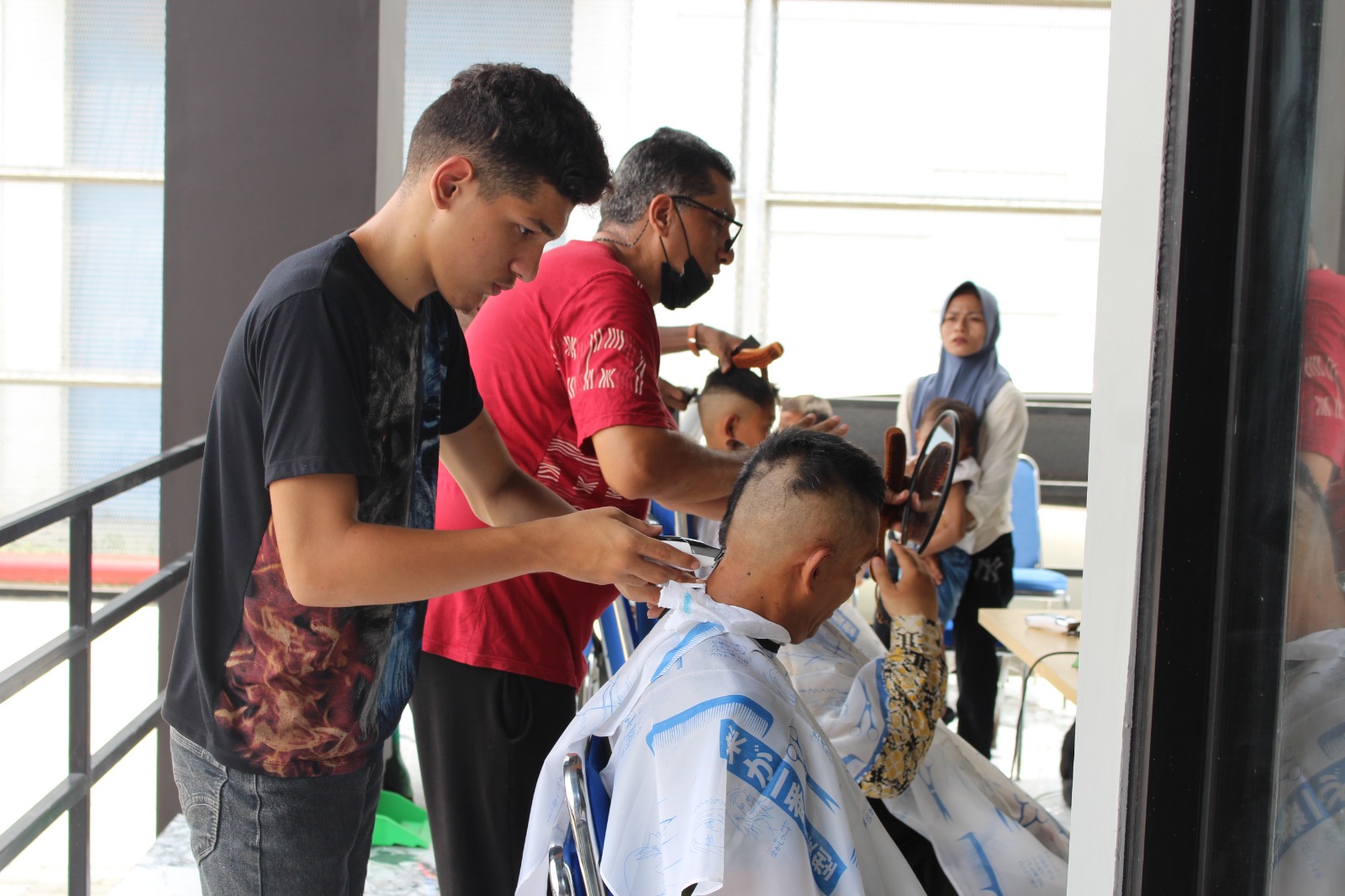 Yang membuat kegiatan ini semakin menarik, pangkas rambut kali ini turut menghadirkan tenaga pemangkas dari kalangan pengungsi yang tinggal di Community House, tempat penampungan sementara pengungsi di Kota Medan. Para pengungsi asal Palestina dan Sudan tersebut ikut berpartisipasi setelah melalui koordinasi resmi dengan International Organization for Migration (IOM) Medan. Hal ini menjadikan suasana kegiatan berlangsung aman, tertib, dan penuh keakraban lintas budaya.