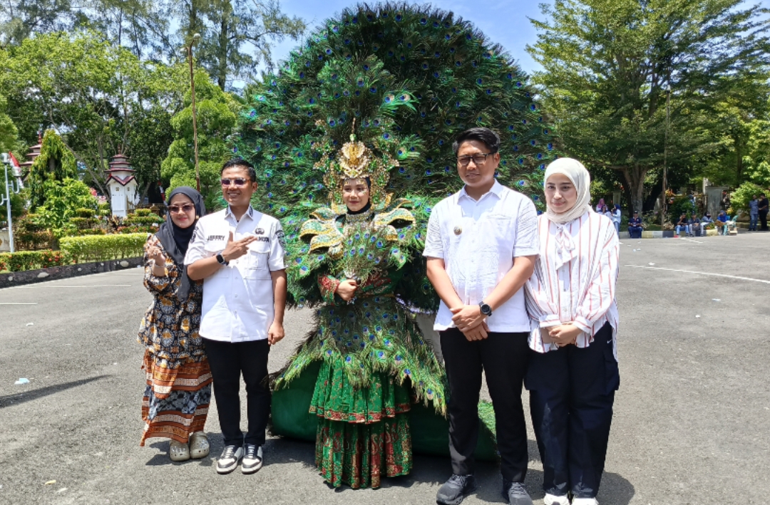 Siti Aisyah Suhana Bila Kelas XI F. 9 yang mengenakan pakaian burung Kolibri berwarna kuning keemasan menjadi pusat perhatian warga ketika menyusuri rute pawai alegoris di Kota Langsa (Foto : Timelinesinews.com)