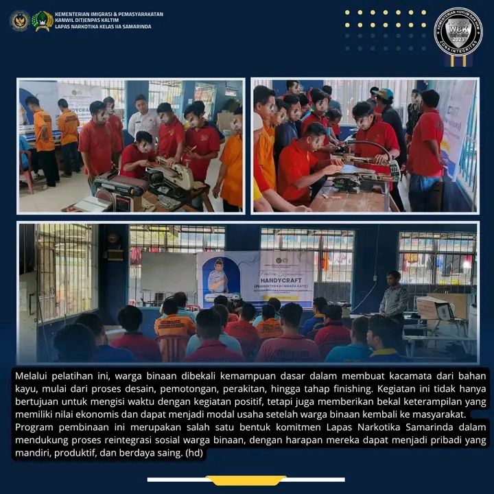 Pelatihan handycraft ini menjadi salah satu wujud nyata implementasi pembinaan yang tidak hanya bersifat teoritis, namun juga aplikatif dan bernilai ekonomis. Dengan adanya kegiatan seperti ini, Lapas Narkotika Samarinda berupaya menciptakan lingkungan pembinaan yang mendukung tumbuhnya pribadi yang mandiri, produktif, dan berdaya saing, Ungkapnya.