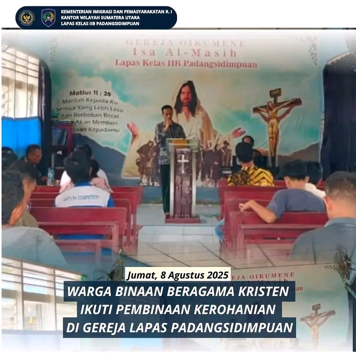 TIMELINES INEWS INVESTIGASI, Padangsidimpuan Suasana khidmat dan penuh haru menyelimuti Gereja Oikumene yang berada di dalam Lembaga Pemasyarakatan Kelas IIB Padangsidimpuan pagi ini. Puluhan warga binaan terlihat khusyuk mengikuti kegiatan pembinaan kerohanian yang rutin dilaksanakan sebagai bagian dari program pembinaan kepribadian. Jumat (08/08/25)