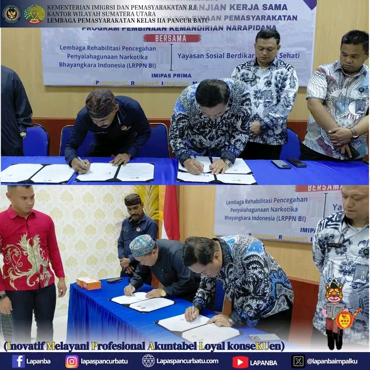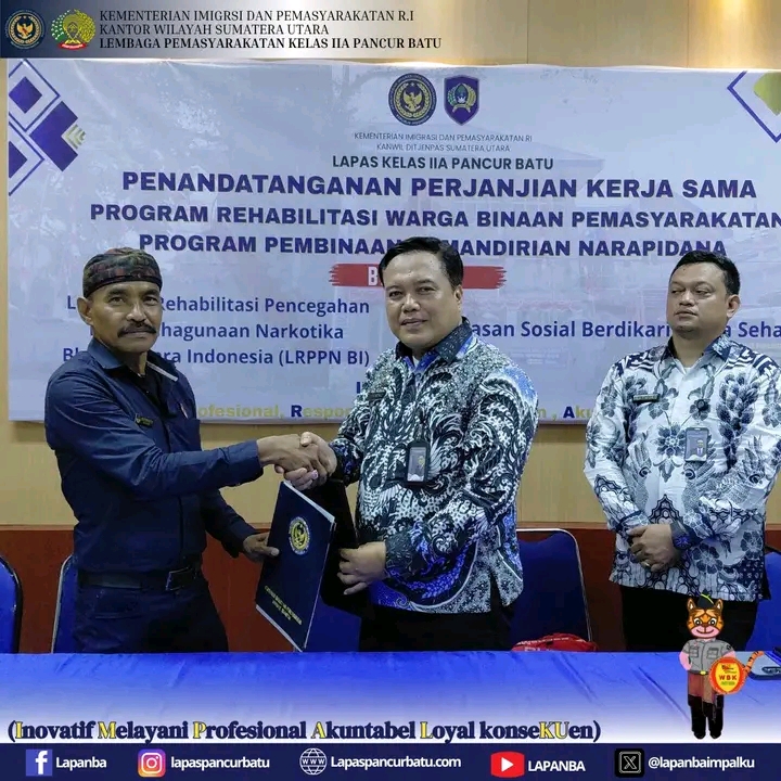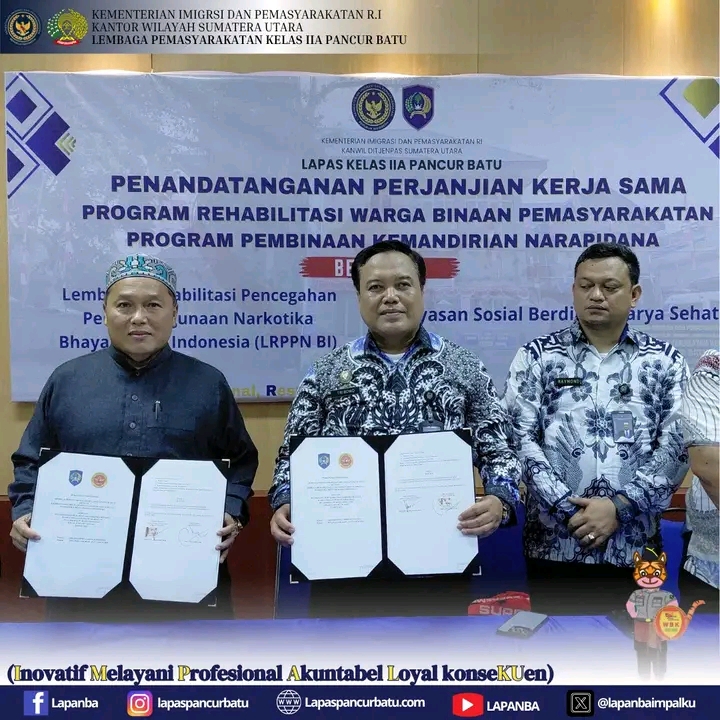 TIMELINES INEWS INVESTIGASI, Pancur Batu Upaya demi upaya, serta Komitmen Lembaga Pemasyarakatan (Lapas) Kelas IIA Pancur Batu dalam mendukung pemulihan Warga Binaan agar dapat diterima Kembali ditengah masyarakat, kembali ditegaskan melalui penandatanganan Perjanjian Kerja Sama (PKS) dengan Lembaga Rehabilitasi Pencegahan Penyalahagunaan Narkotika Bhayangkara Indonesia (LRPPN BI), serta Yayasan Sosial Berdikari Sehati, Kamis (07/8). Bertempat diruang Aula Saharjo Lantai II Lapas Pancur Batu. Langkah ini menjadi bagian dari penguatan program rehabilitasi dan Pmbinaan berbasis kemanusiaan dan kolaboratif.