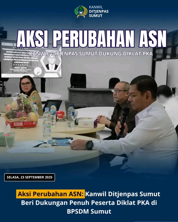 TIMELINES INEWS INVESTIGASI, Medan Kantor Wilayah Direktorat Jenderal Pemasyarakatan (Kanwil Ditjenpas) Sumatera Utara menunjukkan komitmennya dalam mendukung peningkatan kualitas kepemimpinan aparatur sipil negara (ASN). Hal ini diwujudkan melalui kehadiran Kepala Bidang Pelayanan dan Pembinaan, Hamdi Hasibuan, yang bertindak sebagai mentor dalam kegiatan Pendidikan dan Pelatihan Kepemimpinan Administrator (PKA) di Balai Pengembangan Sumber Daya Manusia (BPSDM) Provinsi Sumatera Utara, Selasa (23/09/2025).