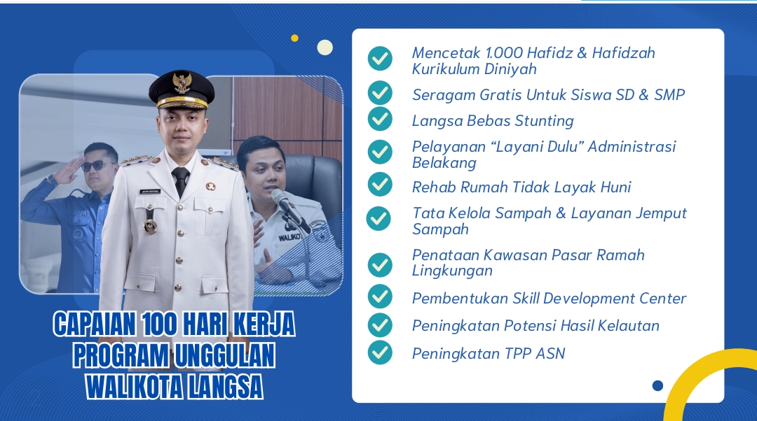 Walikota Langsa Jeffry Sentana S Putra dengan ini menyampaikan berbagai capaian 100 hari kerja kepemimpinan Langsa Juara periode 2025-2030. Ini tidak terlepas dari kerja keras dan kerja ikhlas kita semua, yang ikut mensukseskan visi dan misi kami melalui 22 program unggulan Langsa Juara.
