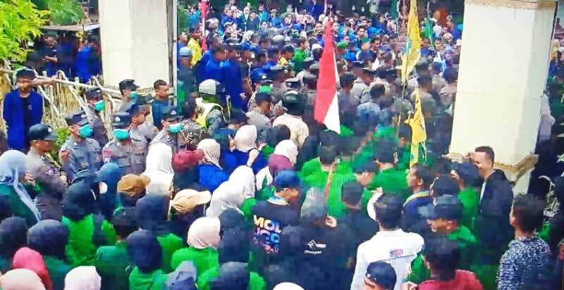 Sebelumnya, aparat kepolisian yang berjaga melakukan pegaman menutup rapat pintu masuk sehingga mahasiswa tidak bisa masuk ke halaman gedung.