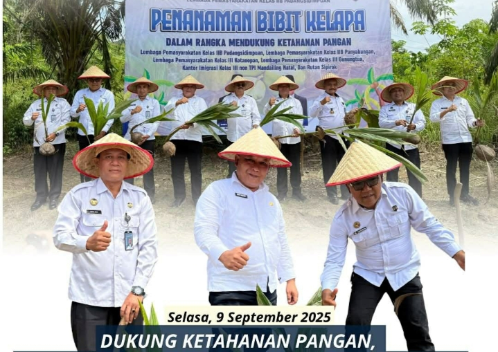TIMELINES INEWS INVESTIGASI, Padangsidimpuan Lapas Padangsidimpuan Laksanakan penanaman pohon kelapa sebagai wujud nyata mendukung ketahanan pangan sekaligus wujud kepedulian terhadap lingkungan, kegiatan ini berlangsung di Kebun Lapas yang merupakan sarana Asimilasi Lapas Padangsidimpuan, Selasa (09/09/2025)