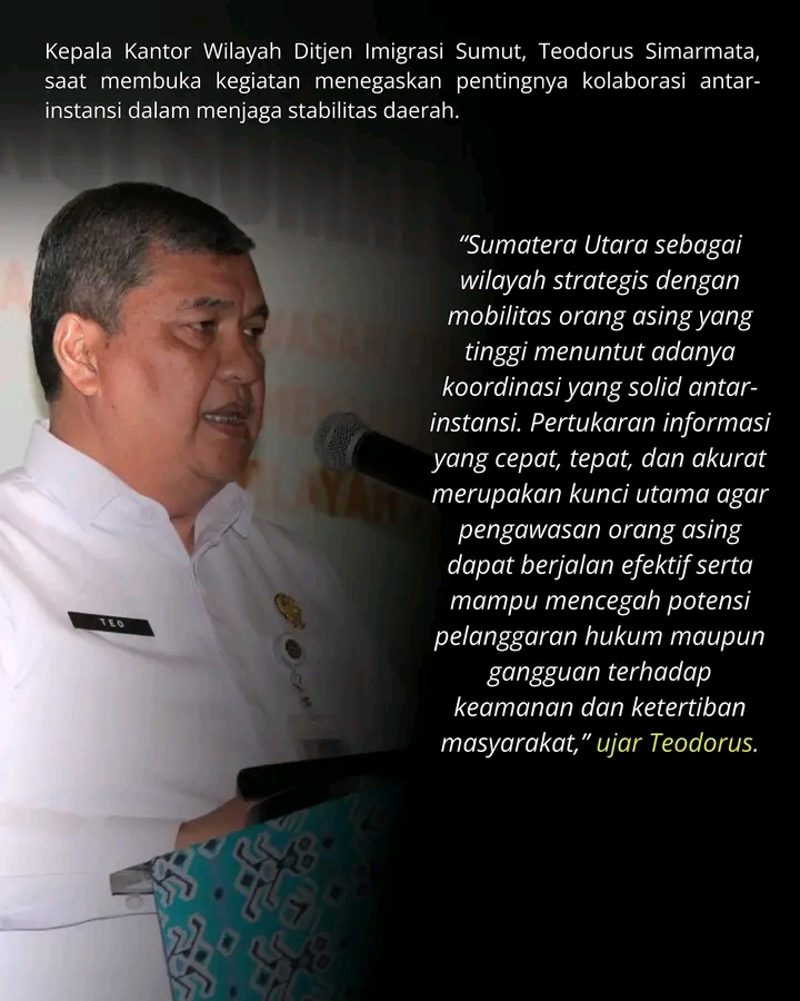 “Sumatera Utara sebagai wilayah strategis dengan mobilitas orang asing yang tinggi menuntut adanya koordinasi yang solid antar-instansi. Pertukaran informasi yang cepat, tepat, dan akurat merupakan kunci utama agar pengawasan orang asing dapat berjalan efektif serta mampu mencegah potensi pelanggaran hukum maupun gangguan terhadap keamanan dan ketertiban masyarakat,” ujar Teodorus.