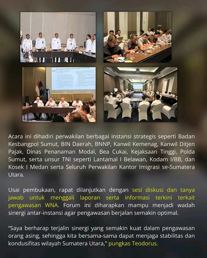 Kepala Kantor Wilayah Ditjen Imigrasi Sumut, Teodorus Simarmata, dalam sambutannya menegaskan pentingnya sinergi antar-instansi untuk menjaga stabilitas keamanan di wilayah Sumut yang memiliki mobilitas WNA cukup tinggi.