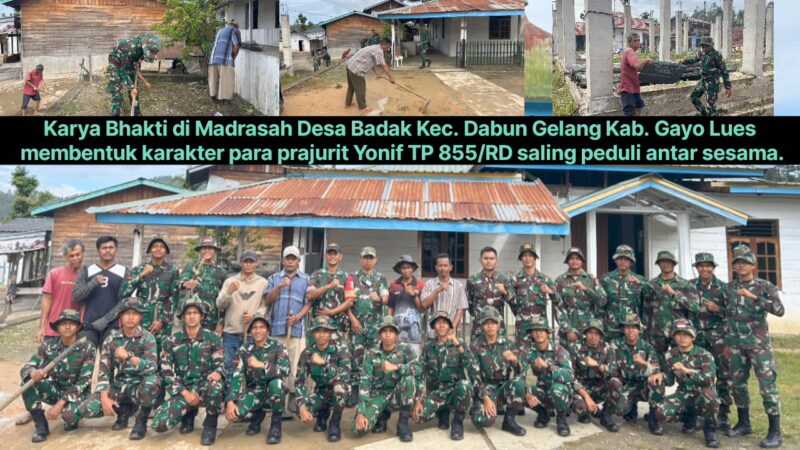 TLii | Aceh – Gayo Lues, Jumat 5 September 2025 – Prajurit Yonif TP 855/RD melaksanakan karya bhakti bersama masyarakat di Madrasah Desa Badak, Kecamatan Dabun Gelang, Kabupaten Gayo Lues. Kegiatan ini dipimpin langsung oleh Sekretaris Desa (Sekdes) Muhammad Syah, dengan melibatkan perangkat desa, tokoh masyarakat, serta warga sekitar.