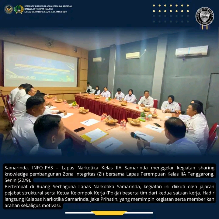 TIMELINES INEWS INVESTIGASI, Samarinda Lapas Narkotika Kelas IIA Samarinda menggelar kegiatan sharing knowledge pembangunan Zona Integritas (ZI) bersama Lapas Perempuan (LPP) Kelas IIA Tenggarong pada Senin (22/9), bertempat di Ruang Serbaguna Lapas Narkotika Samarinda.