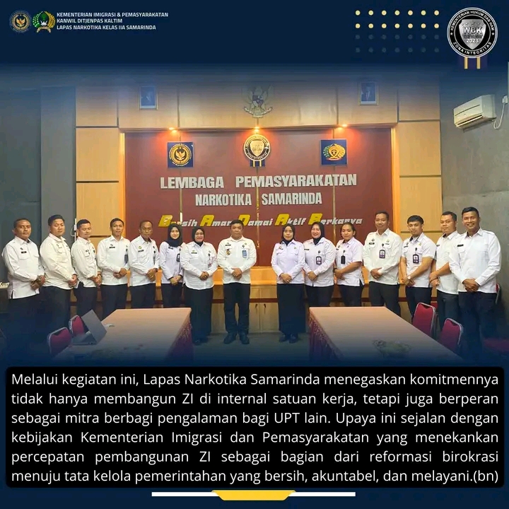 Melalui kegiatan ini, Lapas Narkotika Samarinda menegaskan komitmennya tidak hanya fokus membangun ZI di internal satuan kerja, tetapi juga berperan sebagai mitra berbagi pengalaman bagi UPT lain. Upaya ini sejalan dengan kebijakan Kementerian Imigrasi dan Pemasyarakatan yang menekankan percepatan pembangunan Zona Integritas sebagai bagian dari reformasi birokrasi menuju tata kelola pemerintahan yang bersih, akuntabel, dan melayani, Jelasnya.