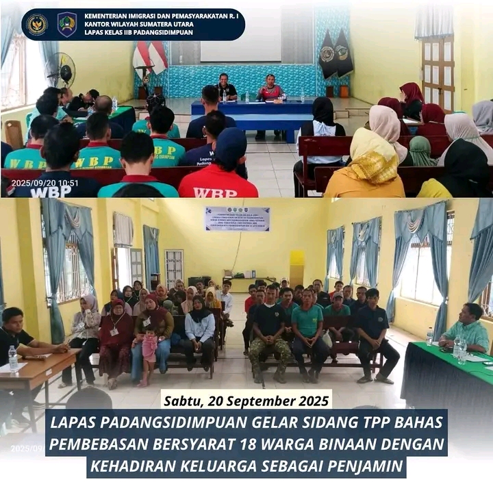 TIMELINES INEWS INVESTIGASI, Padangsidimpuan, 20 September 2025 Lembaga Pemasyarakatan (Lapas) Kelas IIB Padangsidimpuan menyelenggarakan Sidang Tim Pengamat Pemasyarakatan (TPP) untuk membahas usulan pembebasan bersyarat bagi 18 warga binaan, Sabtu (20/09). Sidang ini turut dihadiri oleh keluarga warga binaan yang akan menjadi penjamin apabila permohonan pembebasan bersyarat disetujui.