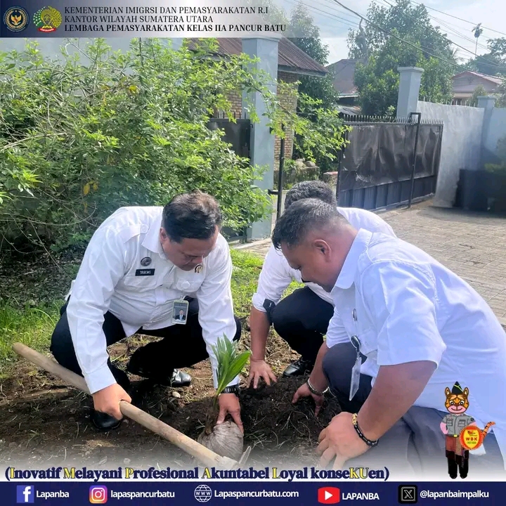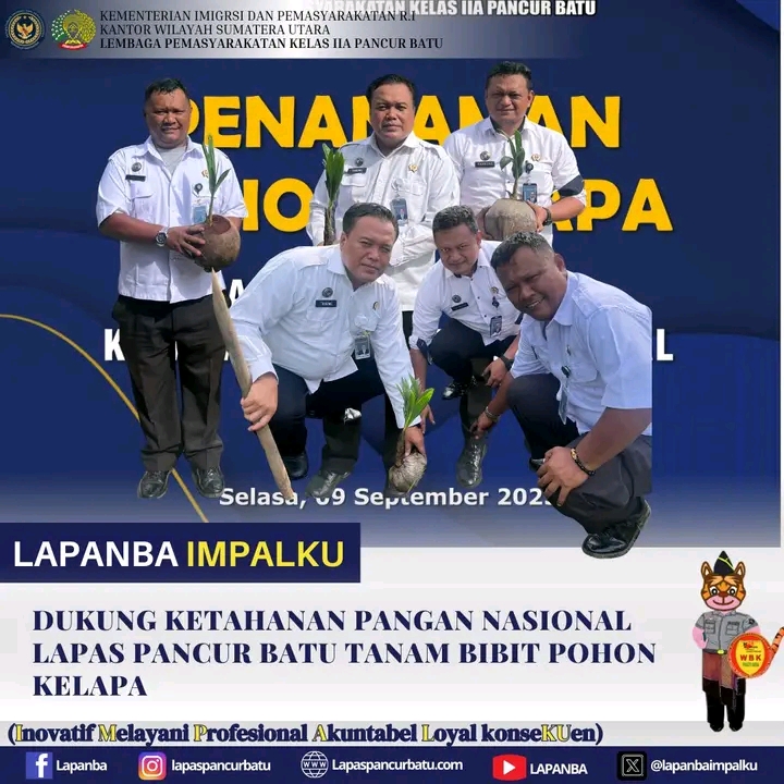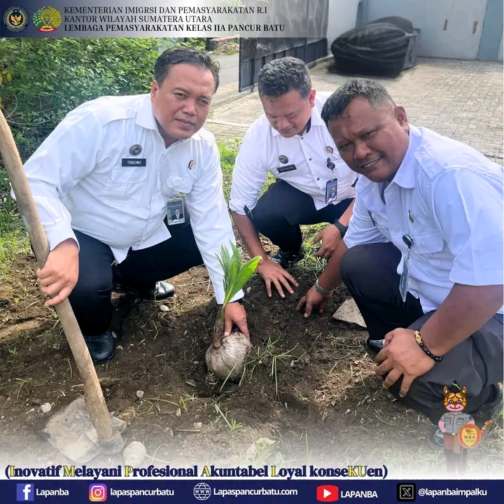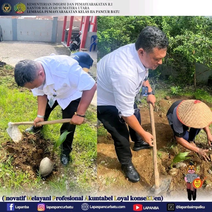 Lembaga Pemasyarakatan (Lapas) Kelas IIA Pancur Batu melaksanakan kegiatan penanaman bibit pohon kelapa di area sekitar lapas sebagai wujud nyata dukungan terhadap program ketahanan pangan nasional. Kegiatan ini merupakan bagian dari gerakan serentak pemasyarakatan seluruh Indonesia, yang menanam total 360 ribu bibit pohon kelapa di Kantor Wilayah (Kanwil) maupun Unit Pelaksana Teknis (UPT) Pemasyarakatan.