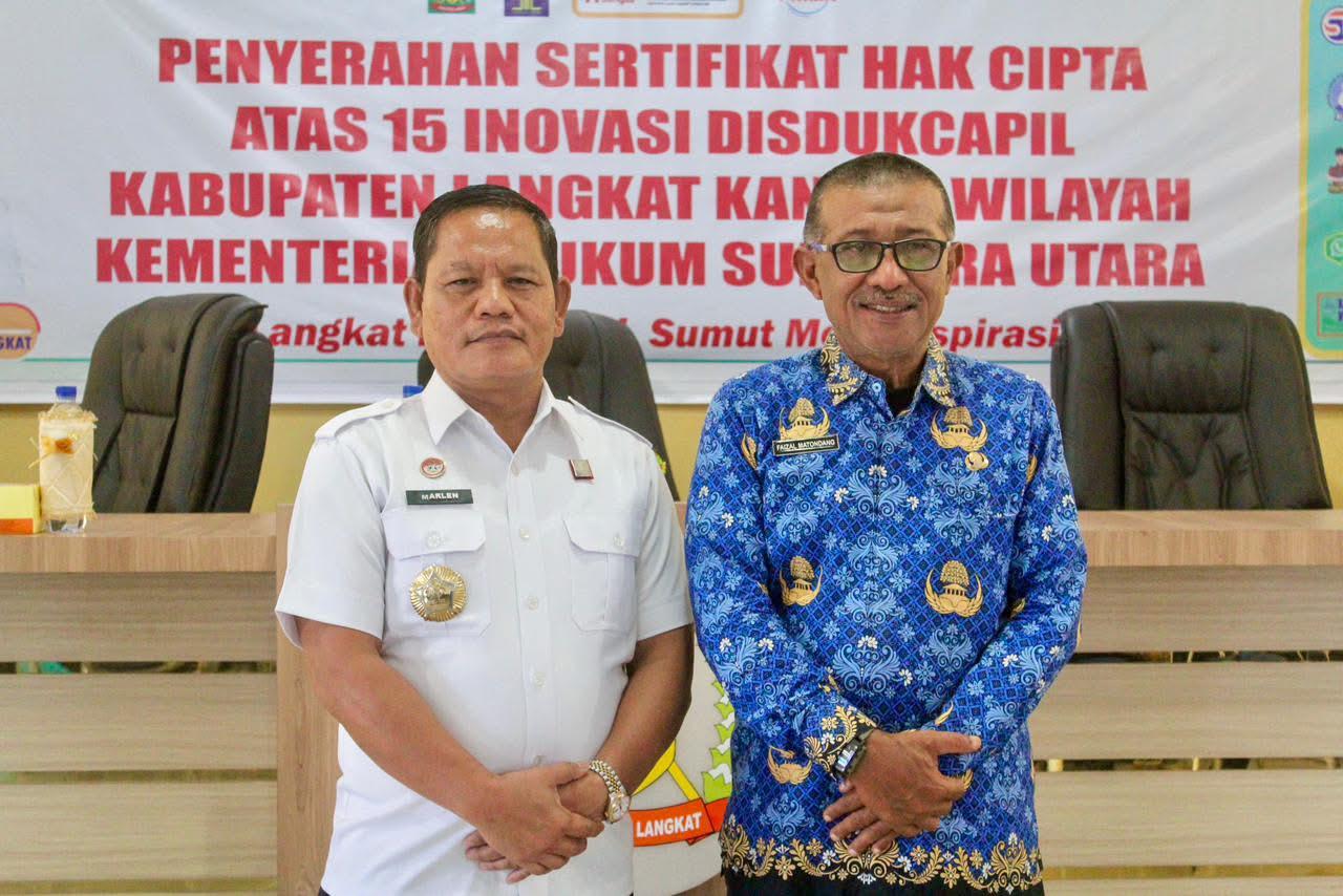 Pada kesempatan tersebut, Kanwil Kemenkumham Sumut diwakili oleh Kepala Divisi Pelayanan Hukum, Sahata Marlen Situngkir, yang menyerahkan secara langsung surat pencatatan ciptaan kepada jajaran Disdukcapil Kabupaten Langkat.