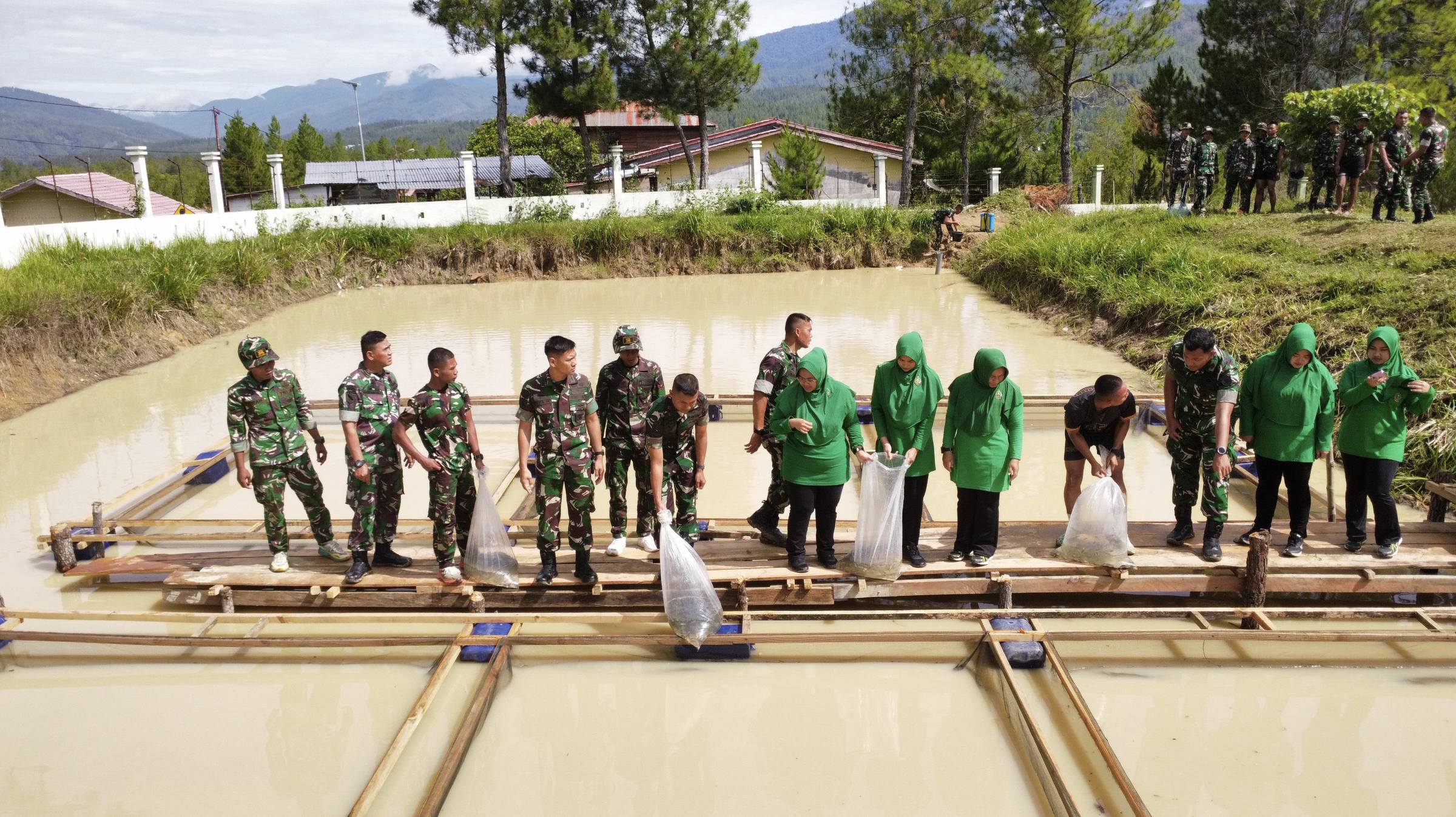 Setelah panen, kegiatan dilanjutkan dengan penebaran benih ikan di kolam budidaya yang telah dipersiapkan sebelumnya. Danyonif secara simbolis menebar benih ikan ke dalam kolam sebagai tanda dimulainya program budidaya perikanan. Langkah ini merupakan bagian dari upaya berkelanjutan satuan dalam mengoptimalkan pemanfaatan lahan untuk produksi protein hewani, sekaligus melengkapi hasil dari sektor pertanian.