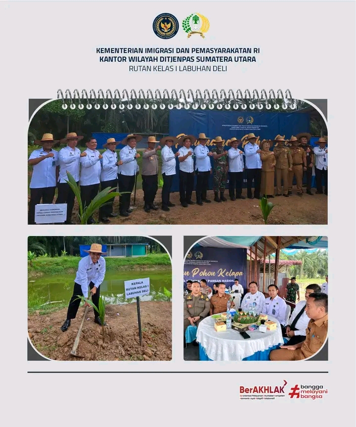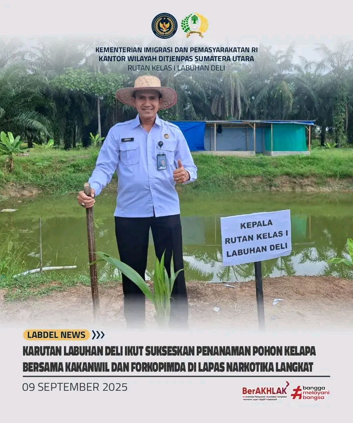 TIMELINES INEWS INVESTIGASI, Langkat, Selasa 09 September 2025 Kepala Rumah Tahanan Negara (Rutan) Kelas I Labuhan Deli, Eddy Junaedi, turut ambil bagian dalam kegiatan penanaman pohon kelapa yang diselenggarakan di Lapas Narkotika Langkat, Sumatera Utara. Kegiatan ini juga dihadiri Kepala Kantor Wilayah (Kakanwil) Ditjen Pemasyarakatan Sumatera Utara, unsur Forkopimda Provinsi Sumatera Utara, serta Pemerintah Kabupaten Langkat.