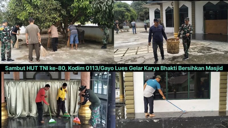 TLii | Aceh | Gayo Lues – Dalam rangka menyambut Hari Ulang Tahun ke-80 Tentara Nasional Indonesia (TNI), Komando Distrik Militer (Kodim) 0113/Gayo Lues melaksanakan kegiatan karya bhakti berupa pembersihan masjid. Kegiatan tersebut berlangsung di Masjid Al Furqan, Desa Kampung Jawa, Kecamatan Blangkejeren, Kabupaten Gayo Lues, pada Sabtu (13/9/2025).