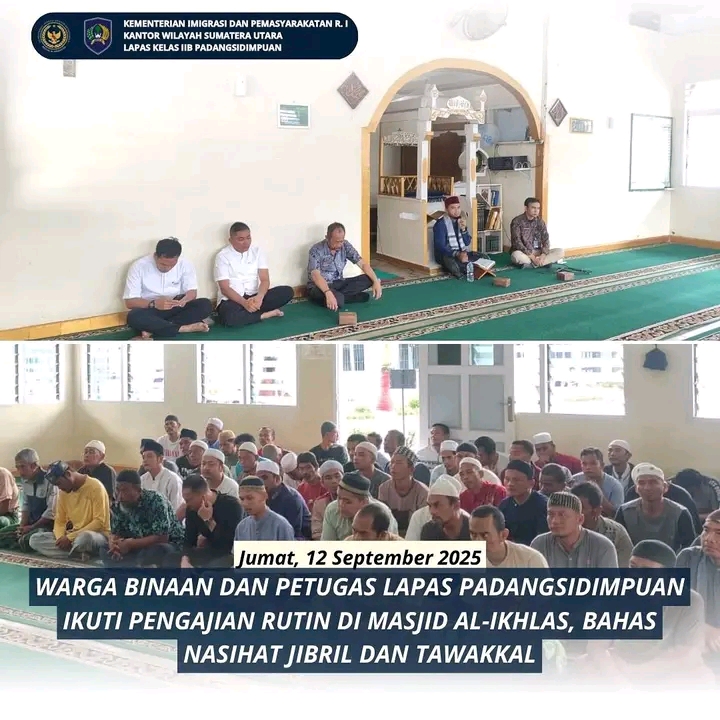 TIMELINES INEWS INVESTIGASI, Padangsidimpuan Suasana religius menyelimuti Masjid Al-Ikhlas Lapas Kelas IIB Padangsidimpuan pada Jumat, (12/09/2025) saat warga binaan dan petugas Lapas bersama-sama mengikuti pengajian rutin. Kegiatan ini menjadi agenda tetap Lapas Padangsidimpuan dalam rangka pembinaan kepribadian, khususnya di bidang keagamaan.