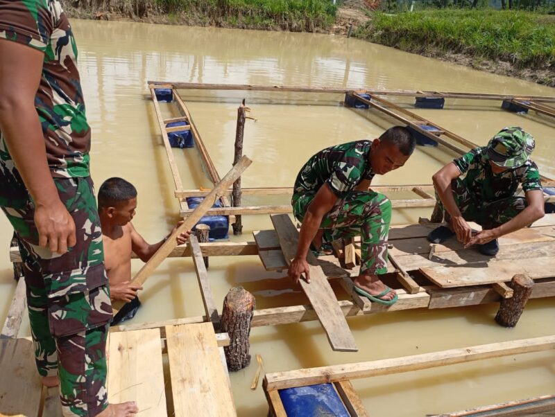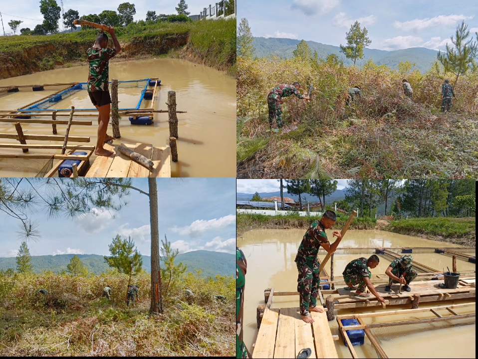 Sejalan dengan upaya tersebut, pada waktu yang dama Kompi Peternakan Yonif TP 855/RD melanjutkan program kemandirian pangan dengan melakukan pembuatan keramba apung dan bedengan. Para prajurit bahu-membahu mempersiapkan bedengan untuk penanaman bibit sayuran, serta merakit keramba apung untuk budidaya ikan.