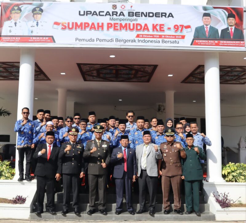 TLii | Aceh | Gayo Lues | Blangkejeren – Dalam rangka memperingati Hari Sumpah Pemuda ke-97 Tahun 2025, Komandan Kodim (Dandim) 0113/Gayo Lues, Letkol Inf Agus Satrio Wibowo, S.I.P, bersama unsur Forkopimda Kabupaten Gayo Lues, menghadiri upacara peringatan yang digelar di halaman Kantor Bupati Gayo Lues, Selasa (28/10/2025).