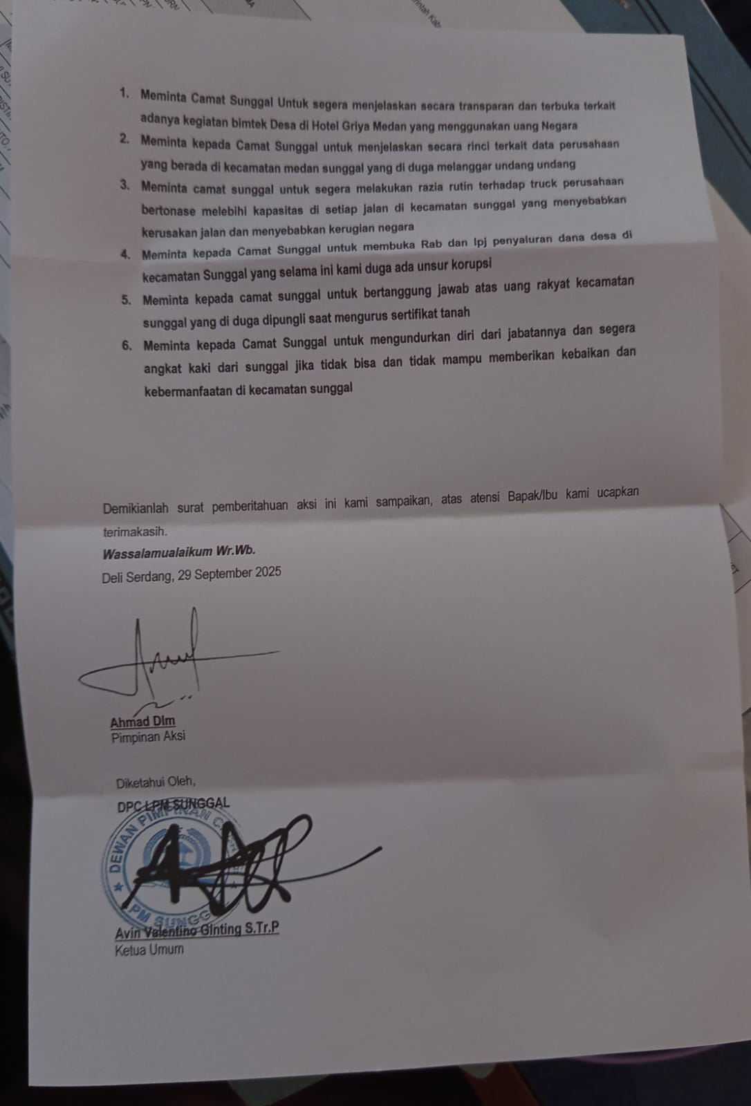 “Kami dukung aspirasi yang membangun Sunggal, tapi jangan salah alamat. Ini seharusnya disampaikan ke Pemkab Deli Serdang,” tegasnya.
