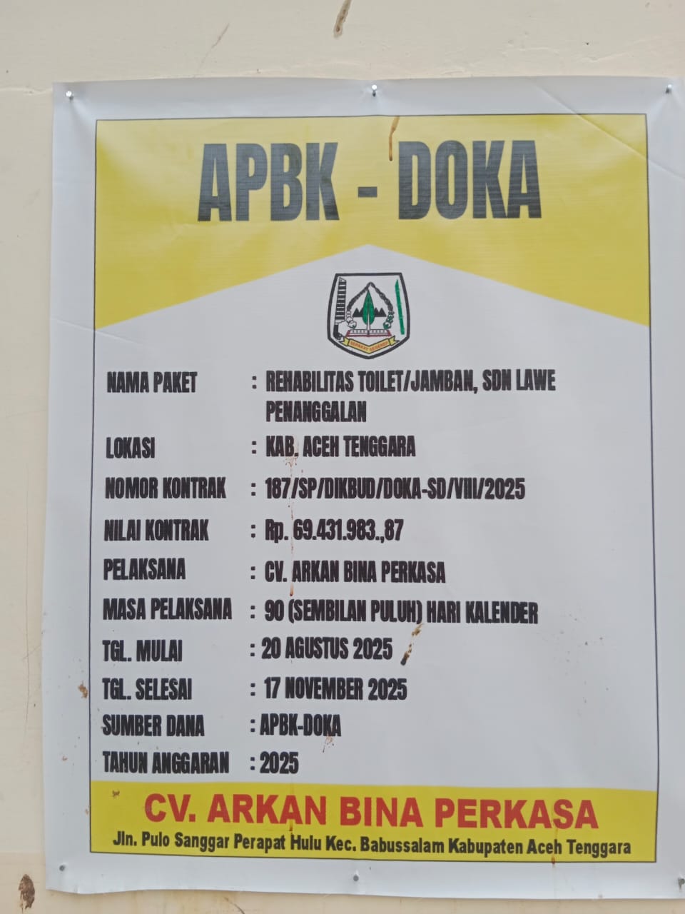 Berdasarkan data yang dihimpun, proyek tersebut tercatat dengan nama paket “Rehab Batas Toilet/Jamban SD Negeri Lawe Penanggalan”, dengan nilai kontrak sebesar Rp 69.431.983,87.