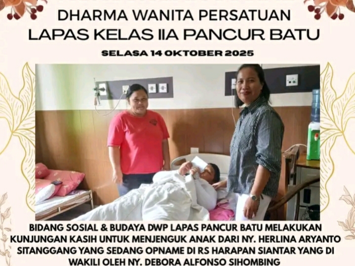 Dalam kesempatan tersebut, DWP Lapas Pancur Batu diwakili oleh Ny. Debora Alfonso Sihombing. Kunjungan ini menjadi bentuk nyata empati dan dukungan moral bagi keluarga yang sedang menghadapi ujian kesehatan.