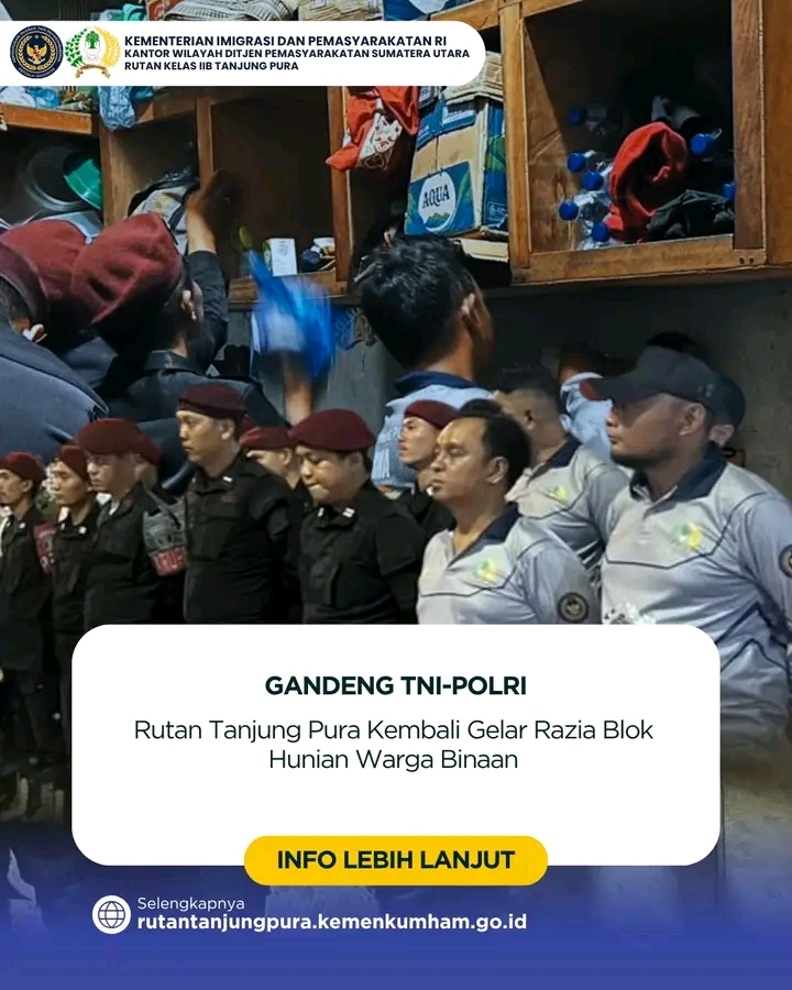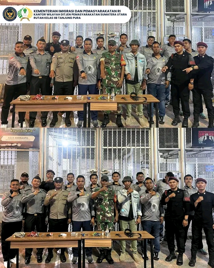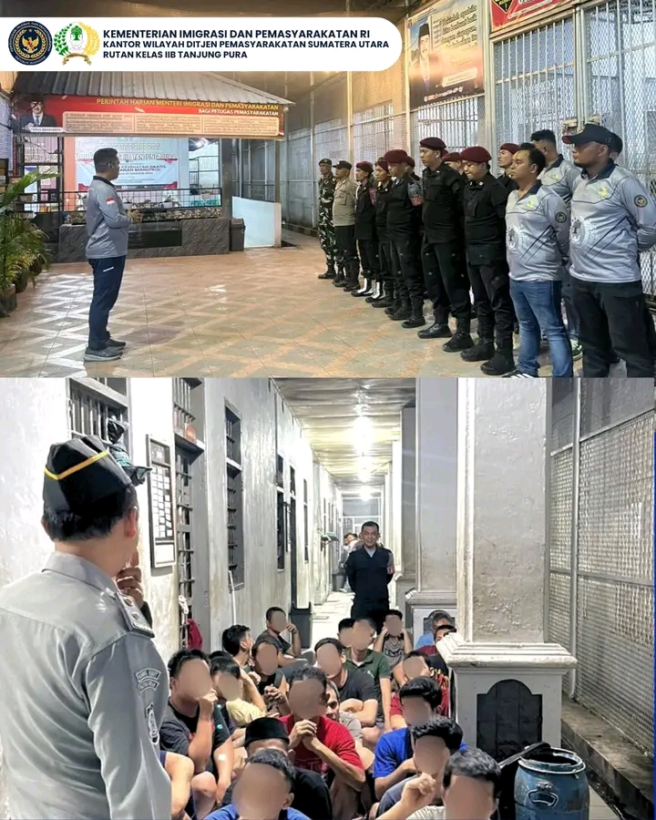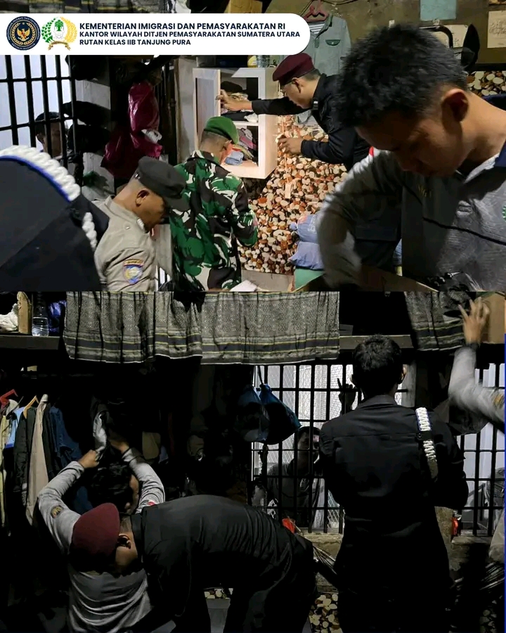 TIMELINES INEWS INVESTIGASI, Tanjung Sabtu 25 Oktober 2025 Pura Rumah Tahanan Negara Kelas IIB Tanjung Pura bersama Kepolisian Sektor (Polsek) Tanjung Pura dan Koramil 11/Tanjung Pura gelar razia gabungan dengan memeriksa beberapa kamar blok hunian. Sabtu (25/10)