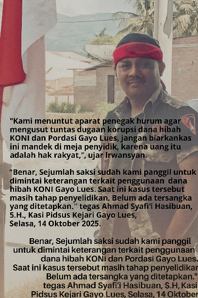 > “Kita meminta aparat penegak hukum (APH) untuk mengusut tuntas dugaan penyalahgunaan dana hibah Dispora Gayo Lues, termasuk dana yang mengalir ke KONI dan PORDASI. Jangan ada yang kebal hukum. Semua harus diperiksa secara terbuka,” tambah Irwansyah.