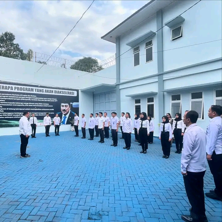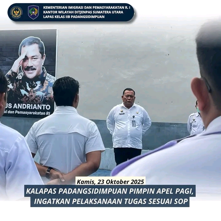 Pemasyarakatan (Lapas) Kelas IIB Padangsidimpuan melaksanakan apel pagi rutin yang dipimpin langsung oleh Kepala Lapas, Mathrios Zulhidayat Hutasoit, di lapangan apel Lapas, Kamis (23/10/2025). Apel tersebut diikuti oleh seluruh pejabat struktural dan jajaran staf.