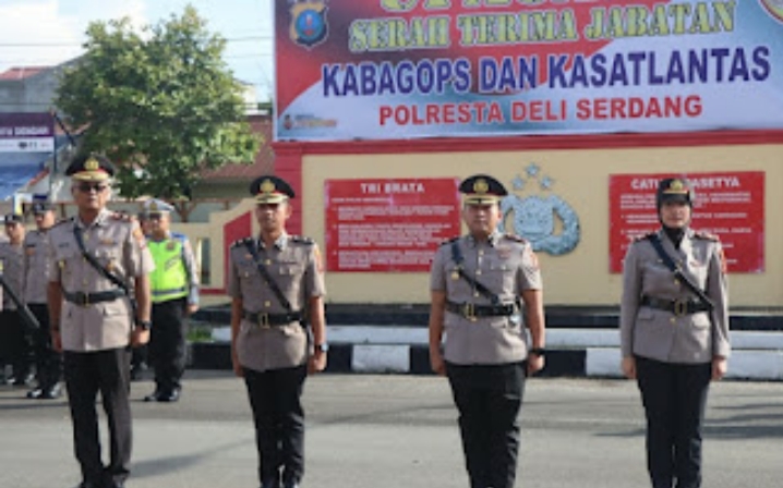 TIMELINES INEWS INVESTIGASI, Deli Serdang, 13 Oktober 2025 Polresta Deli Serdang melaksanakan upacara serah terima jabatan (Sertijab) Kabag Ops dan Kasat Lantas di Lapangan Apel Polresta Deli Serdang, Senin (13/10/2025).