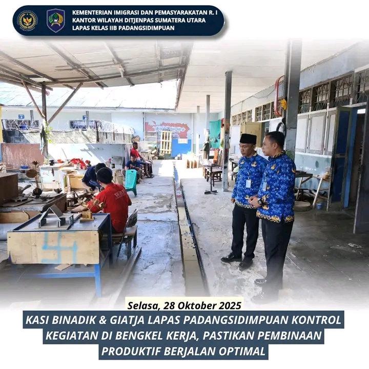 TIMELINES INEWS INVESTIGASI Padangsidimpuan Kepala Seksi Pembinaan Narapidana dan Anak Didik & Kegiatan Kerja (Kasi Binadik & Giatja), Erikjen Silalahi bersama Kepala Subseksi Kegiatan Kerja (Giatja) Lembaga Pemasyarakatan Kelas IIB Padangsidimpuan, Rudy Nasution melakukan kontrol dan monitoring kegiatan pembinaan kemandirian di bengkel kerja Lapas, Selasa (28/10/2025)