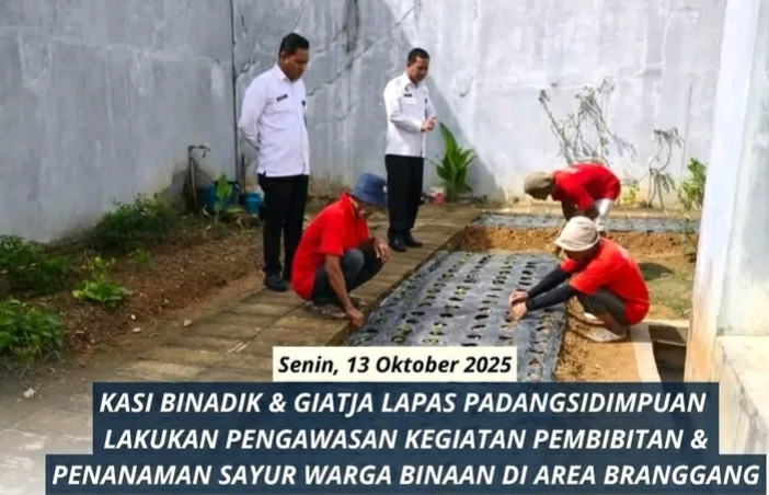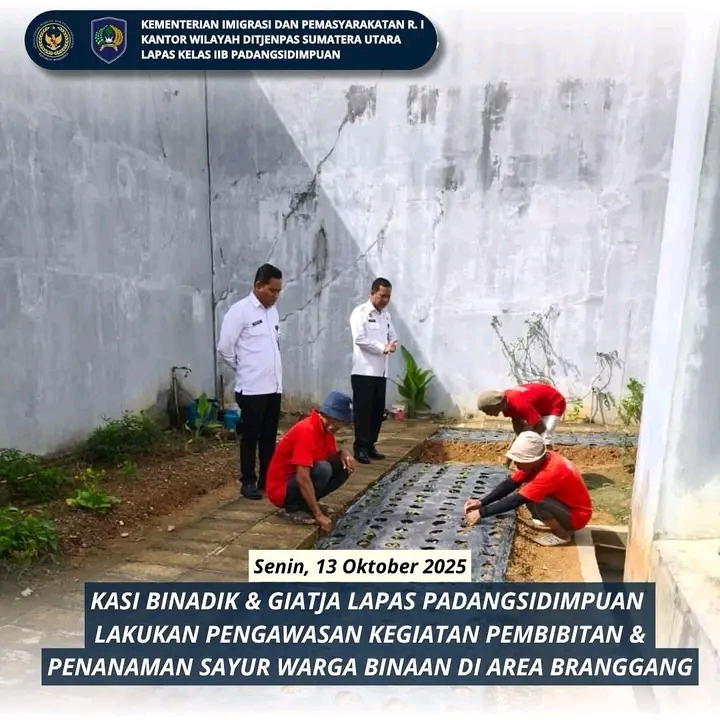 TIMELINES INEWS INVESTIGASI, Padangsidimpuan Dalam rangka meningkatkan efektivitas pembinaan kemandirian bagi warga binaan, Kepala Seksi Bimbingan Narapidana & Kegiatan Kerja (Binadik & Giatja) Lembaga Pemasyarakatan (Lapas) Kelas IIB Padangsidimpuan, Erikjen Silalahi melakukan kunjungan pengawasan ke area branggang pada Senin (13/10/2025). Kegiatan ini berkaitan dengan program pembibitan dan penanaman sayuran yang dikelola oleh warga binaan.