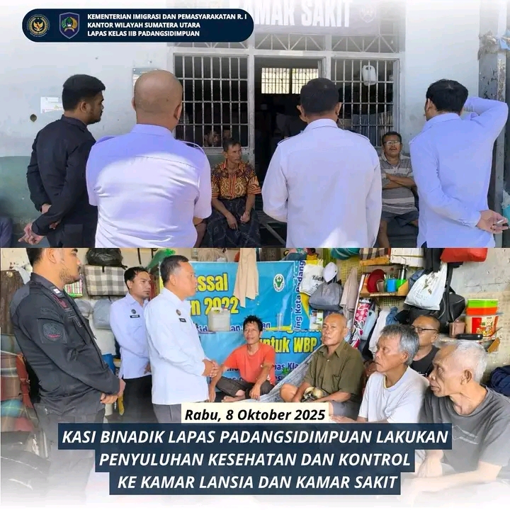 TIMELINES INEWS INVESTIGASI, Padangsidimpuan Kepala Seksi Pembinaan Narapidana dan Anak Didik (Kasi Binadik) Lembaga Pemasyarakatan Kelas IIB Padangsidimpuan, Erikjen Silalahi didampingi kasubsi perawatan M.Zulakply dan Petugas Kesehatan Lapas melakukan kegiatan kontrol dan penyuluhan kesehatan kepada warga binaan yang berada di kamar lansia dan kamar sakit, Rabu (7/10/2025).